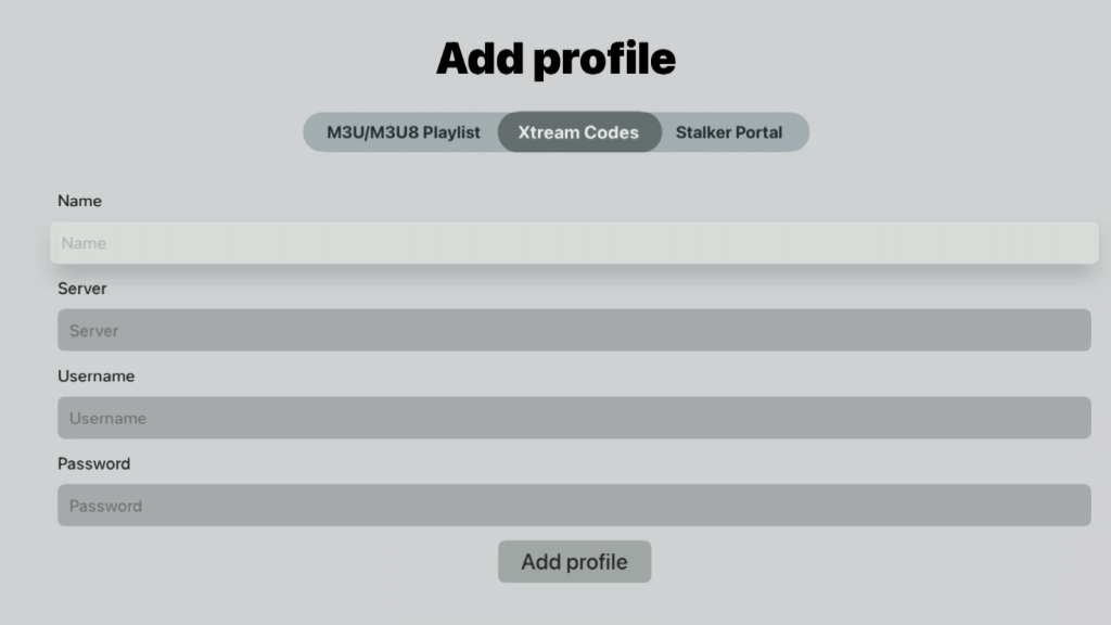 Välj “Xtream Codes”, som är det mittersta alternativet på bilden nedan. I fältet “Name” skriver du “ expressiptv”. I fältet “Server” fyller du i din Portal URL, som du får från oss vid gratis test eller köp. Tryck sedan på knappen “Add profile”.